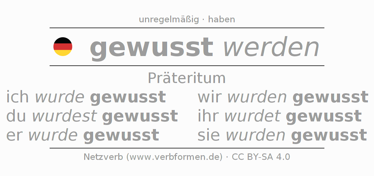 Die Konjugation von wissen im Präteritum Indikativ Vergangenheit Vorgangspassiv ist: ich wurde gewusst, du wurdest gewusst, er wurde gewusst, wir wurden gewusst, ihr wurdet gewusst, sie wurden gewusst.Die Bildung dieser Formen entspricht gewissen grammatischen Regeln. So auch die Vorgaben zur Konjugation der einfachen Verbformen von wissen im Präteritum. 7Kommentare ☆3.6