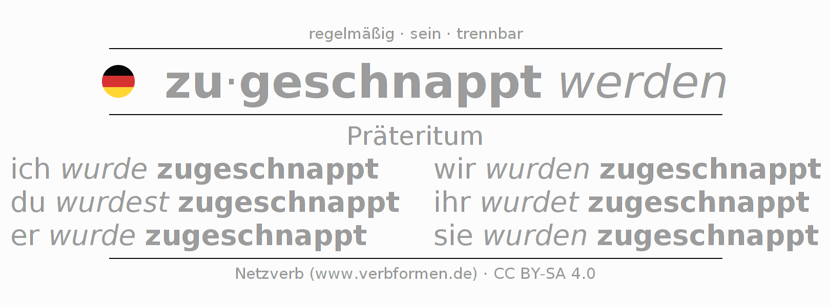Das Verb zuschnappen (ist) vollständig in allen Personen und Numeri im Präteritum Indikativ konjugiert