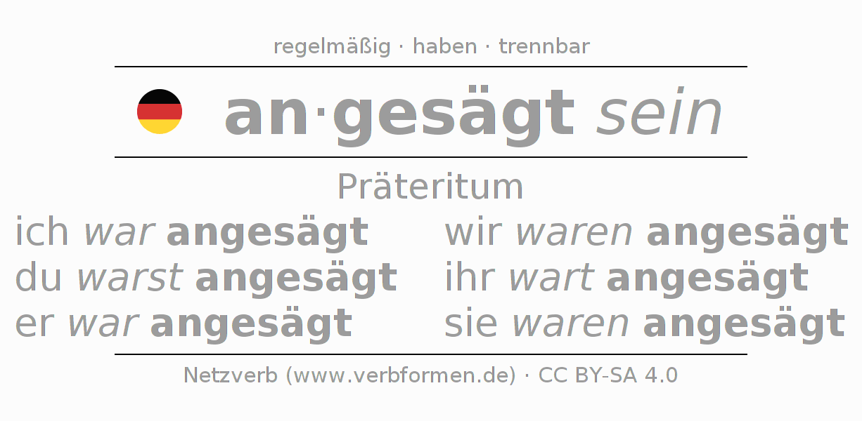 Die Konjugation von ansägen im Präteritum Indikativ Vergangenheit Zustandspassiv ist: ich war angesägt, du warst angesägt, er war angesägt, wir waren angesägt, ihr wart angesägt, sie waren angesägt.Die Bildung dieser Formen entspricht gewissen grammatischen Regeln. So auch die Vorgaben zur Konjugation der einfachen Verbformen von ansägen im Präteritum. Kommentare ☆