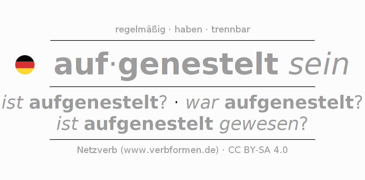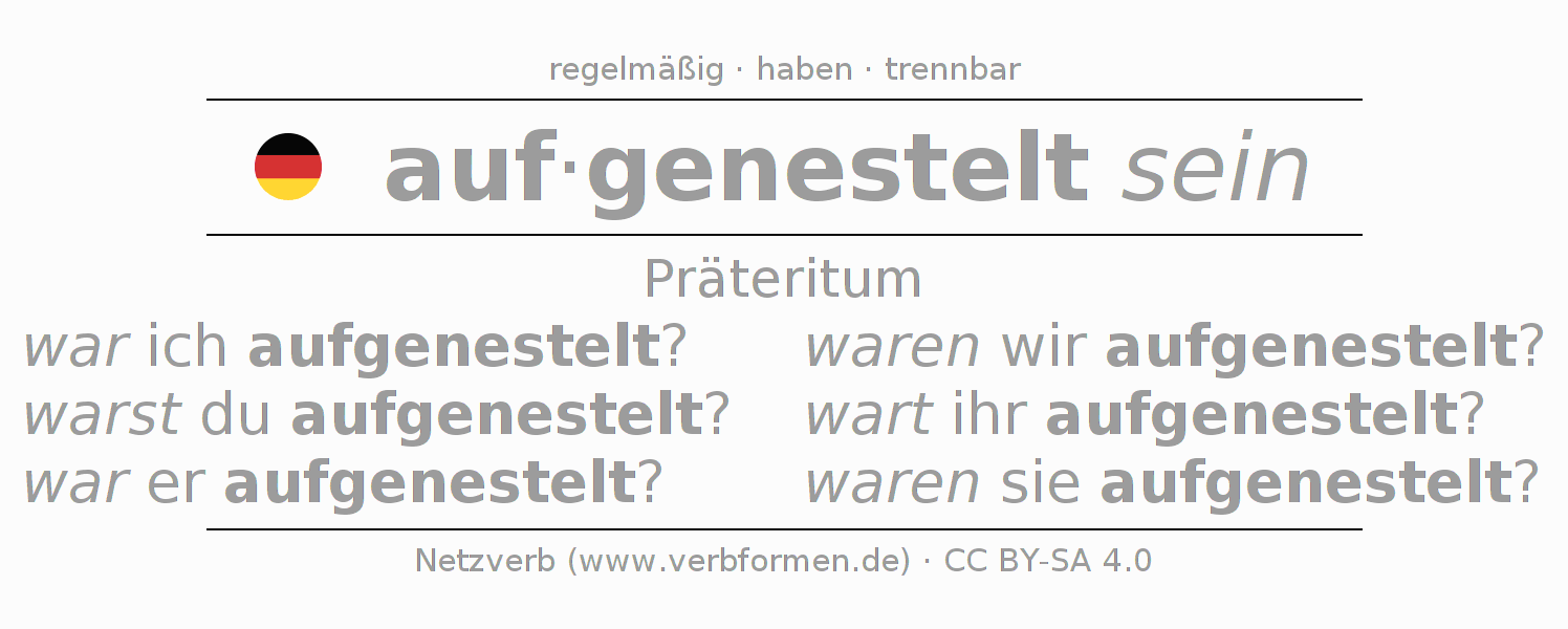 Die Konjugation von aufnesteln im Präteritum Indikativ Vergangenheit Zustandspassiv ist: war ich aufgenestelt?, warst du aufgenestelt?, war er aufgenestelt?, waren wir aufgenestelt?, wart ihr aufgenestelt?, waren sie aufgenestelt?.Die Bildung dieser Formen entspricht gewissen grammatischen Regeln. So auch die Vorgaben zur Konjugation der einfachen Verbformen von aufnesteln im Präteritum. Kommentare ☆