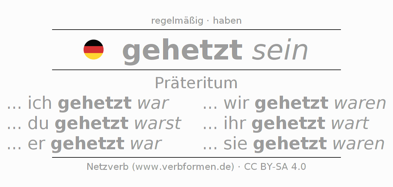 Das Verb hetzen (hat) vollständig in allen Personen und Numeri im Präteritum Indikativ konjugiert