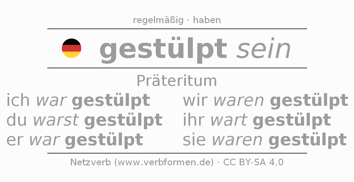 Die Konjugation von stülpen im Präteritum Indikativ Vergangenheit Zustandspassiv ist: ich war gestülpt, du warst gestülpt, er war gestülpt, wir waren gestülpt, ihr wart gestülpt, sie waren gestülpt.Die Bildung dieser Formen entspricht gewissen grammatischen Regeln. So auch die Vorgaben zur Konjugation der einfachen Verbformen von stülpen im Präteritum. Kommentare ☆