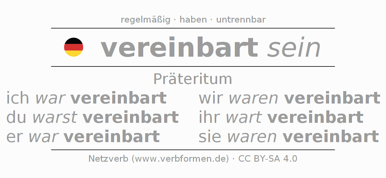 Die Konjugation von vereinbaren im Präteritum Indikativ Vergangenheit Zustandspassiv ist: ich war vereinbart, du warst vereinbart, er war vereinbart, wir waren vereinbart, ihr wart vereinbart, sie waren vereinbart.Die Bildung dieser Formen entspricht gewissen grammatischen Regeln. So auch die Vorgaben zur Konjugation der einfachen Verbformen von vereinbaren im Präteritum. 1Kommentar ☆4.0