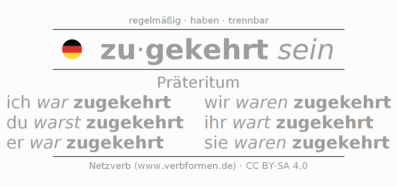 Das Verb zukehren (hat) vollständig in allen Personen und Numeri im Präteritum Indikativ konjugiert