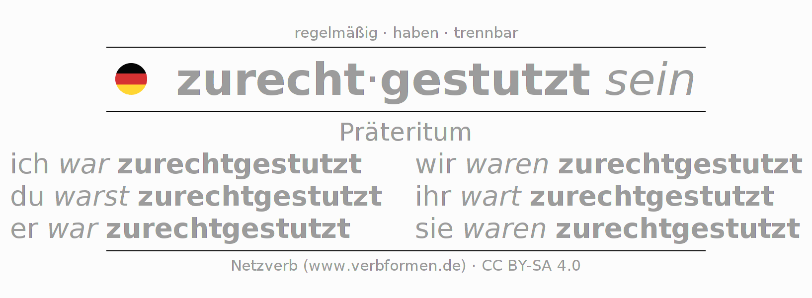 Die Konjugation von zurechtstutzen im Präteritum Indikativ Vergangenheit Zustandspassiv ist: ich war zurechtgestutzt, du warst zurechtgestutzt, er war zurechtgestutzt, wir waren zurechtgestutzt, ihr wart zurechtgestutzt, sie waren zurechtgestutzt.Die Bildung dieser Formen entspricht gewissen grammatischen Regeln. So auch die Vorgaben zur Konjugation der einfachen Verbformen von zurechtstutzen im Präteritum. Kommentare ☆