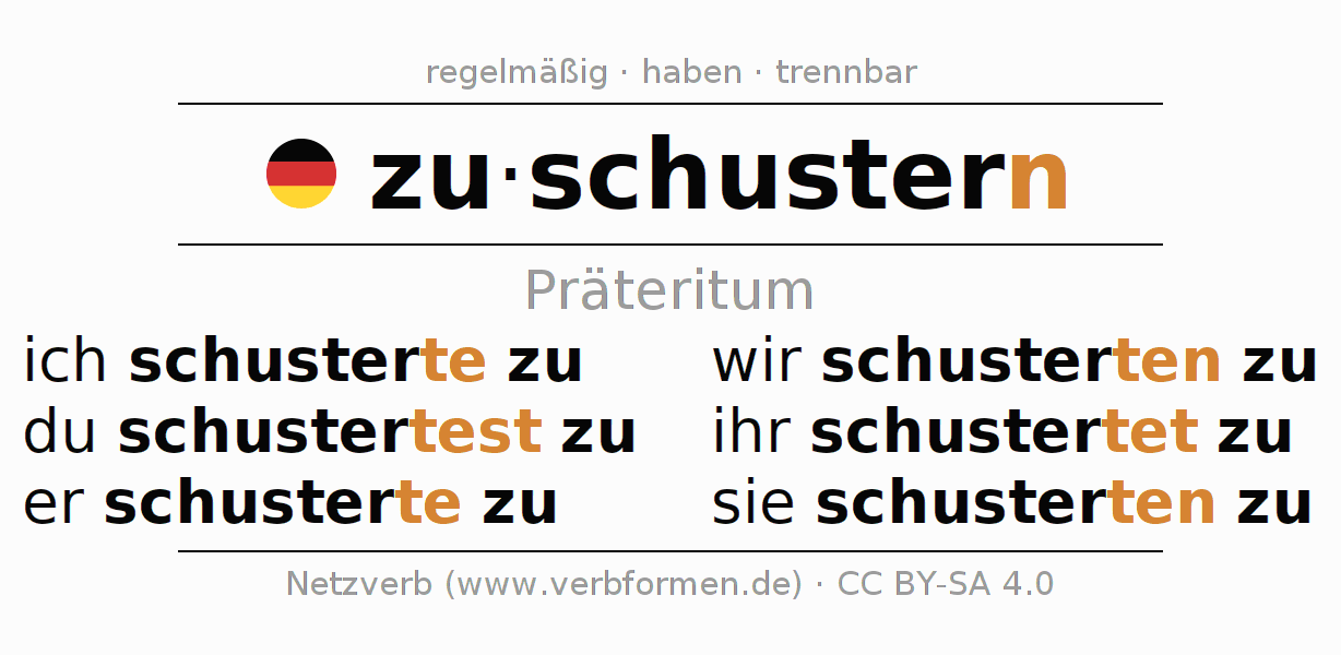 Das Verb zuschustern vollständig in allen Personen und Numeri im Präteritum Indikativ konjugiert