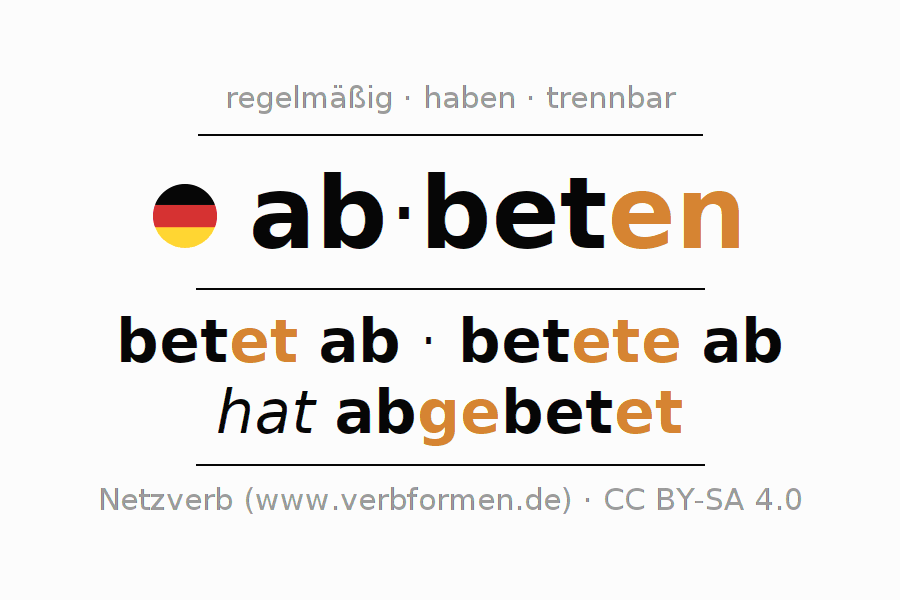 Das Verb abbeten vollständig in allen Personen und Numeri im Infinitiv Präsens Perfekt konjugiert