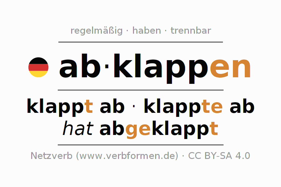 Das Verb abklappen vollständig in allen Personen und Numeri im Infinitiv Präsens Perfekt konjugiert