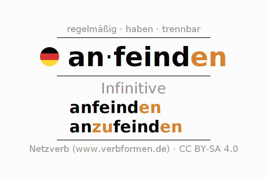 Das Verb anfeinden vollständig in allen Personen und Numeri im Infinitiv Präsens Perfekt konjugiert