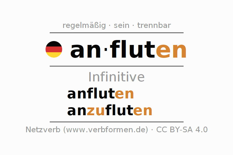 Das Verb anfluten vollständig in allen Personen und Numeri im Infinitiv Präsens Perfekt konjugiert