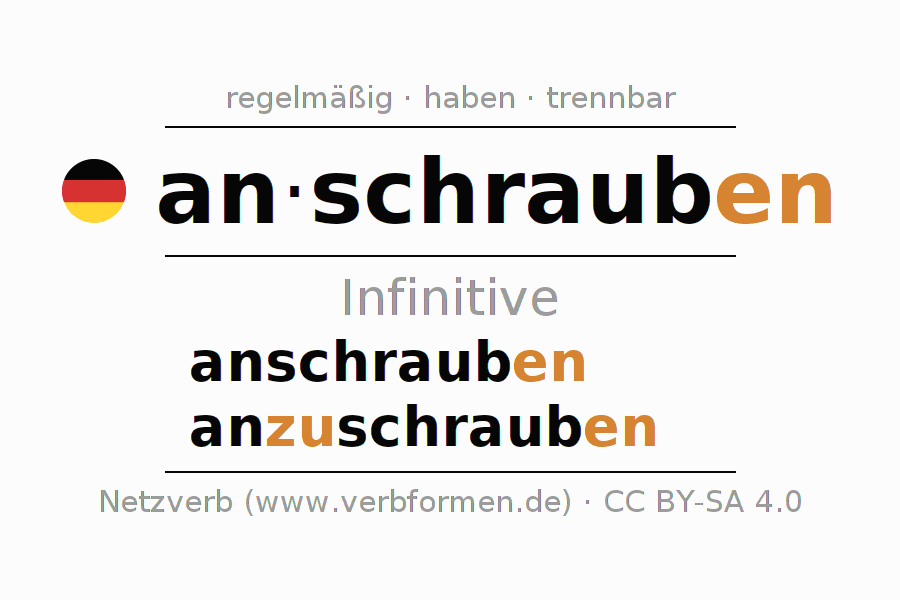 Das Verb anschrauben vollständig in allen Personen und Numeri im Infinitiv Präsens Perfekt konjugiert