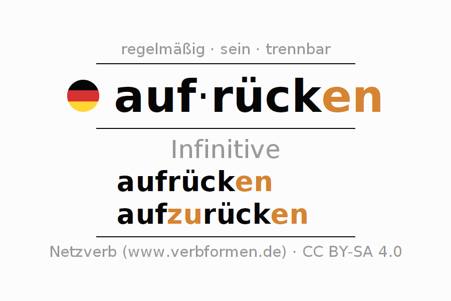 Das Verb aufrücken vollständig in allen Personen und Numeri im Infinitiv Präsens Perfekt konjugiert