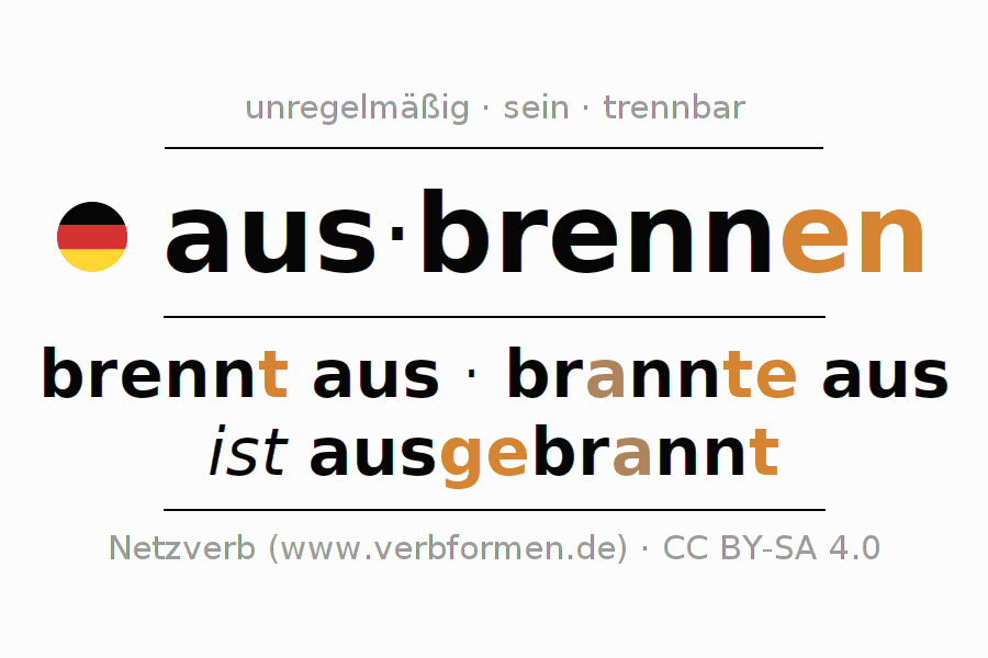 Das Verb ausbrennen vollständig in allen Personen und Numeri im Infinitiv Präsens Perfekt konjugiert