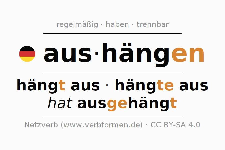Das Verb aushängen vollständig in allen Personen und Numeri im Infinitiv Präsens Perfekt konjugiert