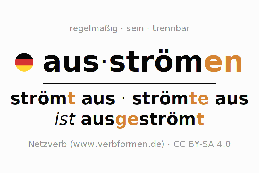Das Verb ausströmen (ist) vollständig in allen Personen und Numeri im Infinitiv Präsens Perfekt konjugiert