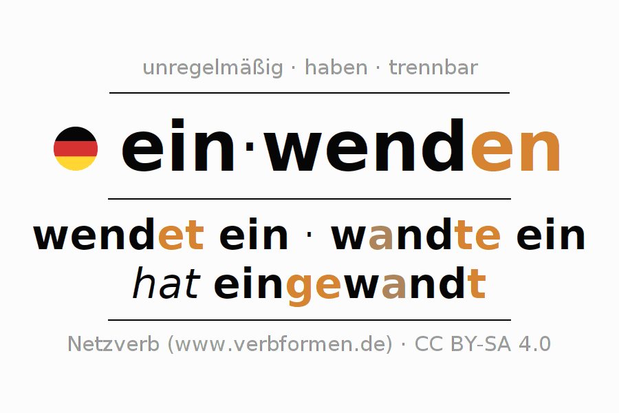 Das Verb einwenden vollständig in allen Personen und Numeri im Infinitiv Präsens Perfekt konjugiert