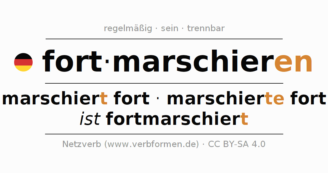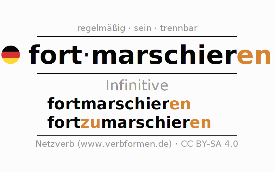 Das Verb fortmarschieren vollständig in allen Personen und Numeri im Infinitiv Präsens Perfekt konjugiert