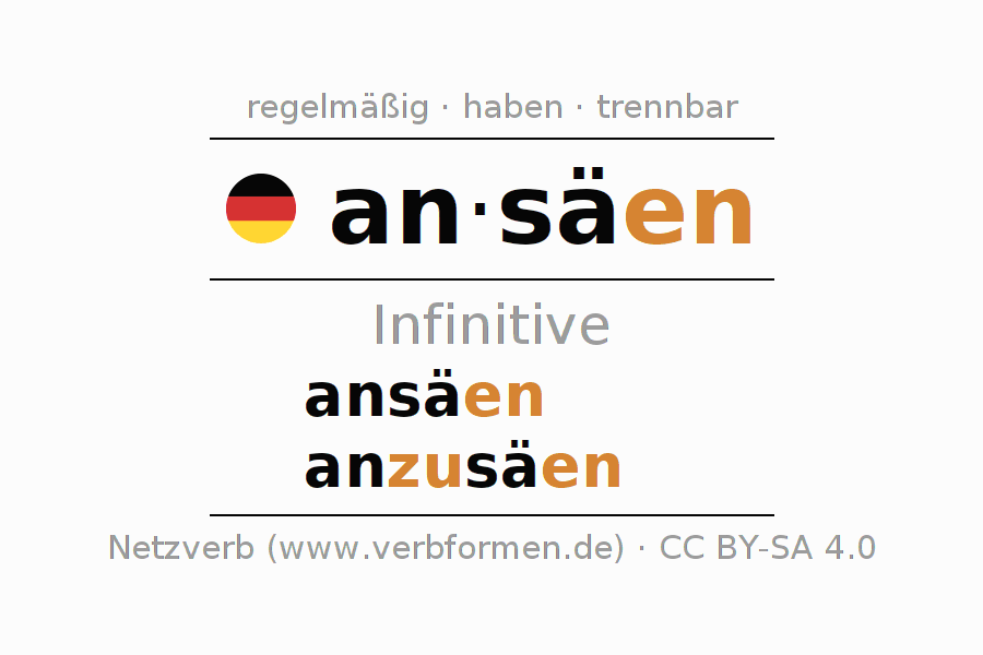 Die Konjugation von ansäen im Infinitiv Präsens Perfekt Grundform Aktiv ist: ansä(e)n, anzusä(e)n.Die Bildung dieser Formen entspricht gewissen grammatischen Regeln. So auch die Vorgaben zur Konjugation der einfachen Verbformen von ansäen im Infinitiv. Kommentare ☆