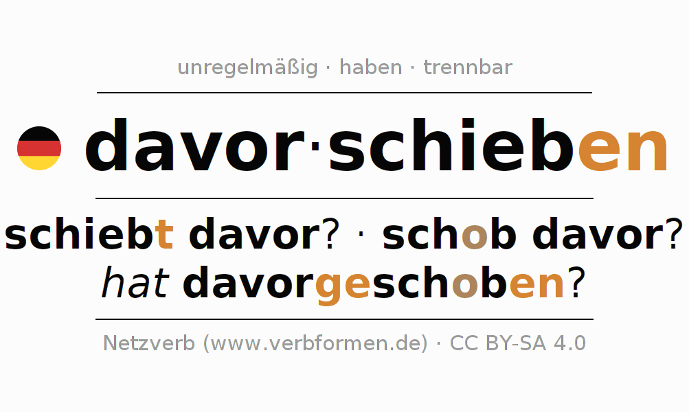Die Konjugation von davorschieben im Infinitiv Präsens Perfekt Grundform Aktiv ist: davorschieben, davorzuschieben.Die Bildung dieser Formen entspricht gewissen grammatischen Regeln. So auch die Vorgaben zur Konjugation der einfachen Verbformen von davorschieben im Infinitiv. Kommentare ☆