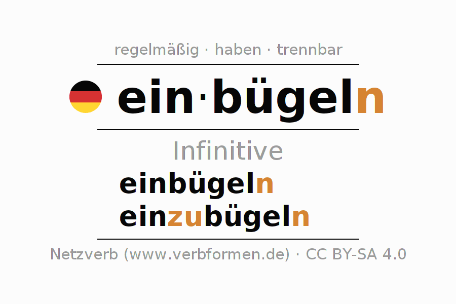 Die Konjugation von einbügeln im Infinitiv Präsens Perfekt Grundform Aktiv ist: einbügeln, einzubügeln.Die Bildung dieser Formen entspricht gewissen grammatischen Regeln. So auch die Vorgaben zur Konjugation der einfachen Verbformen von einbügeln im Infinitiv. Kommentare ☆