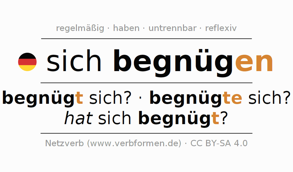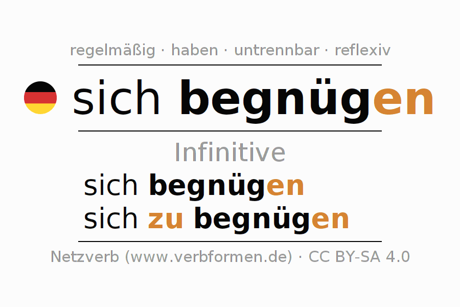 Das Verb sich begnügen vollständig in allen Personen und Numeri im Infinitiv Präsens Perfekt konjugiert