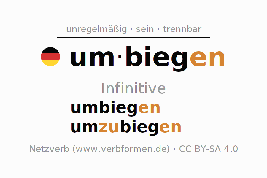 Das Verb umbiegen (ist) vollständig in allen Personen und Numeri im Infinitiv Präsens Perfekt konjugiert