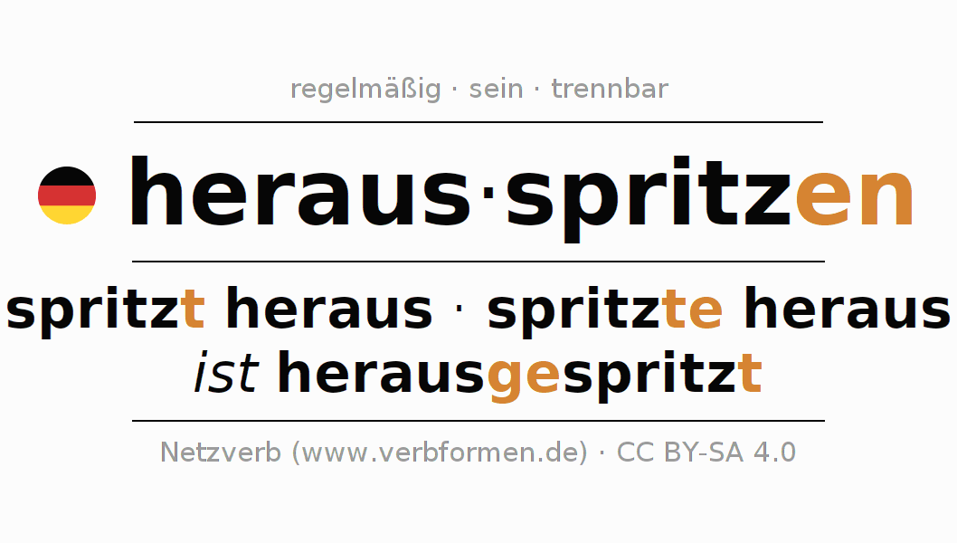 Das Verb herausspritzen vollständig in allen Personen und Numeri im Infinitiv Präsens Perfekt konjugiert