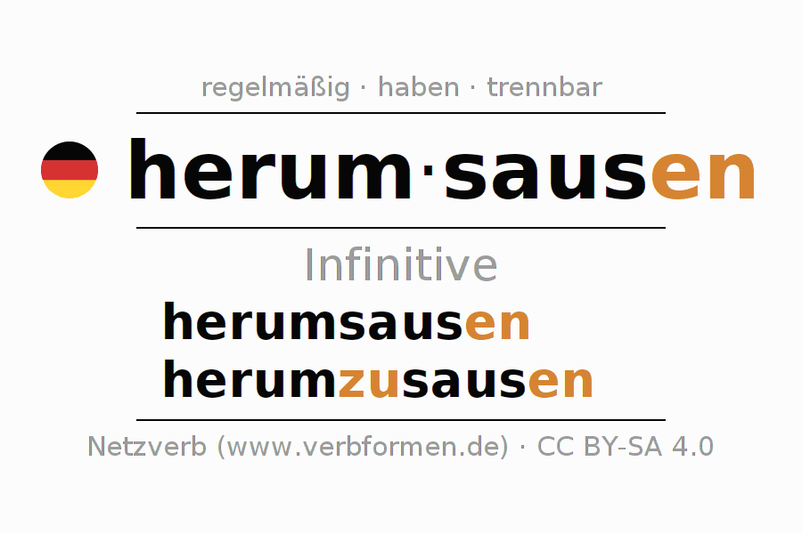 Das Verb herumsausen vollständig in allen Personen und Numeri im Infinitiv Präsens Perfekt konjugiert