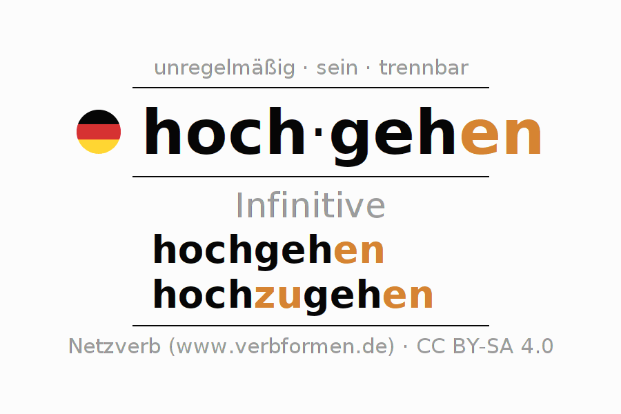 Das Verb hochgehen vollständig in allen Personen und Numeri im Infinitiv Präsens Perfekt konjugiert