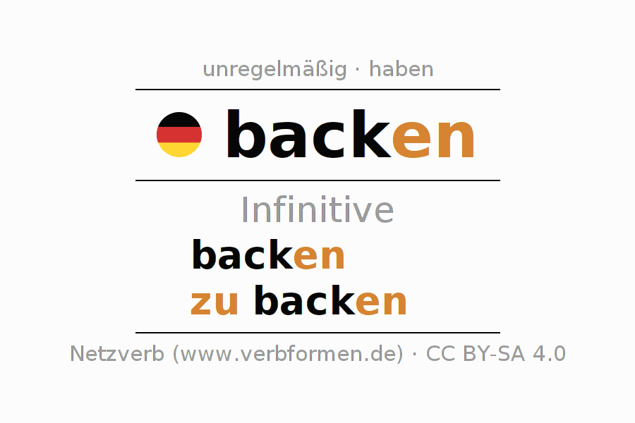 Die Konjugation von backen im Infinitiv Präsens Perfekt Grundform Aktiv ist: backen, zu backen.Die Bildung dieser Formen entspricht gewissen grammatischen Regeln. So auch die Vorgaben zur Konjugation der einfachen Verbformen von backen im Infinitiv. 16Kommentare ☆5.0