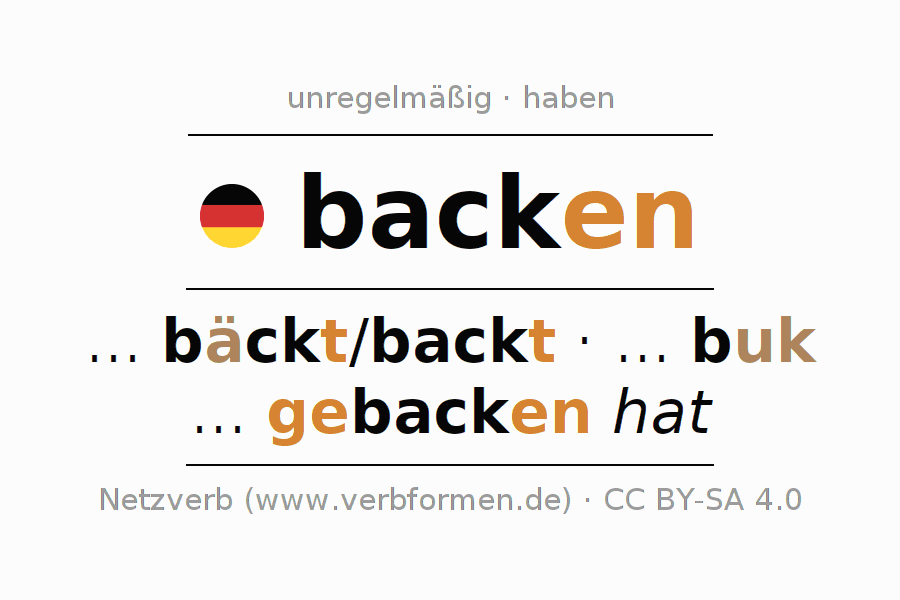 Das Verb backen (unr) vollständig in allen Personen und Numeri im Infinitiv Präsens Perfekt konjugiert