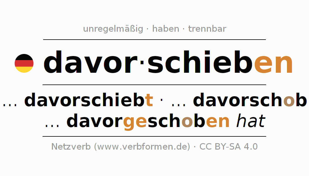 Die Konjugation von davorschieben im Infinitiv Präsens Perfekt Grundform Aktiv ist: davorschieben, davorzuschieben.Die Bildung dieser Formen entspricht gewissen grammatischen Regeln. So auch die Vorgaben zur Konjugation der einfachen Verbformen von davorschieben im Infinitiv. Kommentare ☆