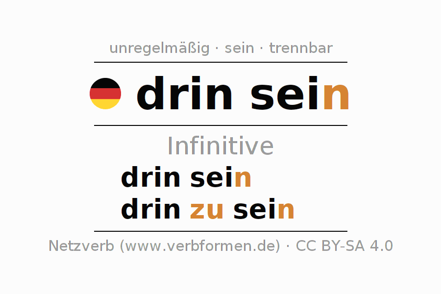 Die Konjugation von drinsein im Infinitiv Präsens Perfekt Grundform Aktiv ist: drin sein, drin zu sein.Die Bildung dieser Formen entspricht gewissen grammatischen Regeln. So auch die Vorgaben zur Konjugation der einfachen Verbformen von drinsein im Infinitiv. Kommentare ☆