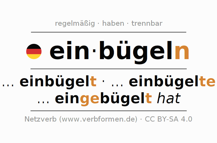 Die Konjugation von einbügeln im Infinitiv Präsens Perfekt Grundform Aktiv ist: einbügeln, einzubügeln.Die Bildung dieser Formen entspricht gewissen grammatischen Regeln. So auch die Vorgaben zur Konjugation der einfachen Verbformen von einbügeln im Infinitiv. Kommentare ☆