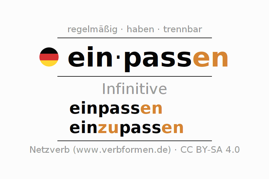 Das Verb einpassen vollständig in allen Personen und Numeri im Infinitiv Präsens Perfekt konjugiert
