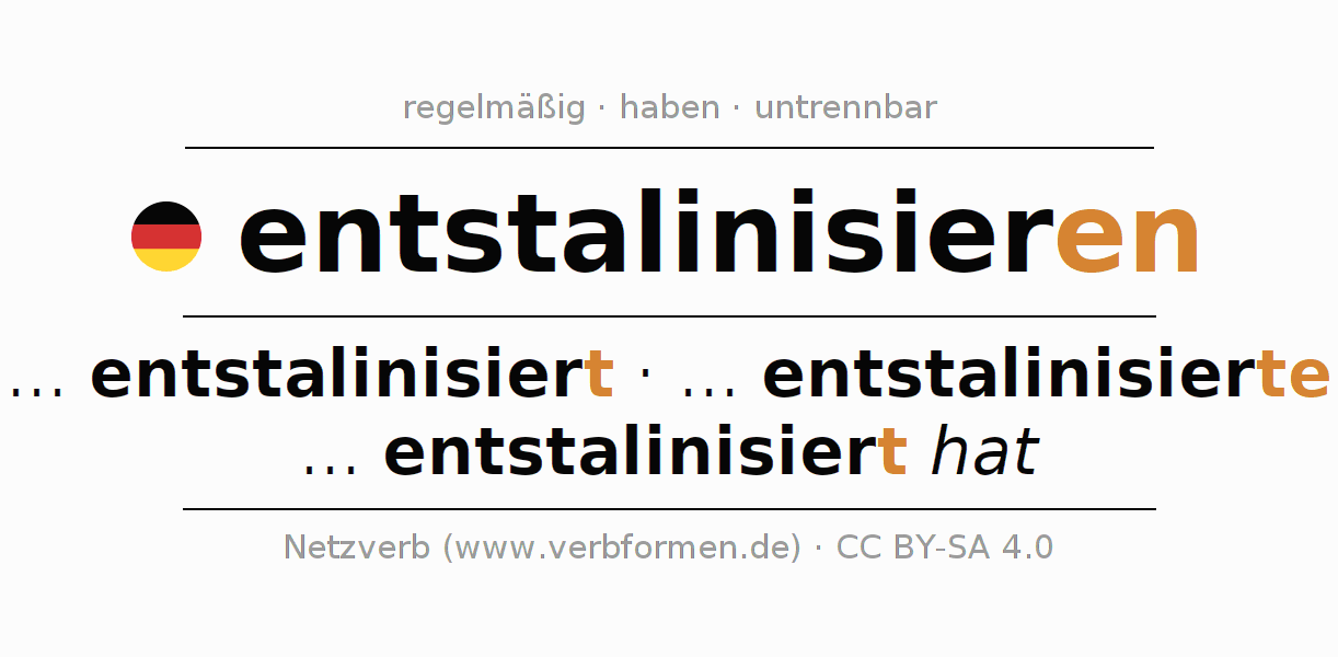 Das Verb entstalinisieren vollständig in allen Personen und Numeri im Infinitiv Präsens Perfekt konjugiert