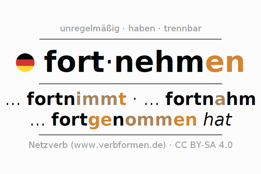 Das Verb fortnehmen vollständig in allen Personen und Numeri im Infinitiv Präsens Perfekt konjugiert