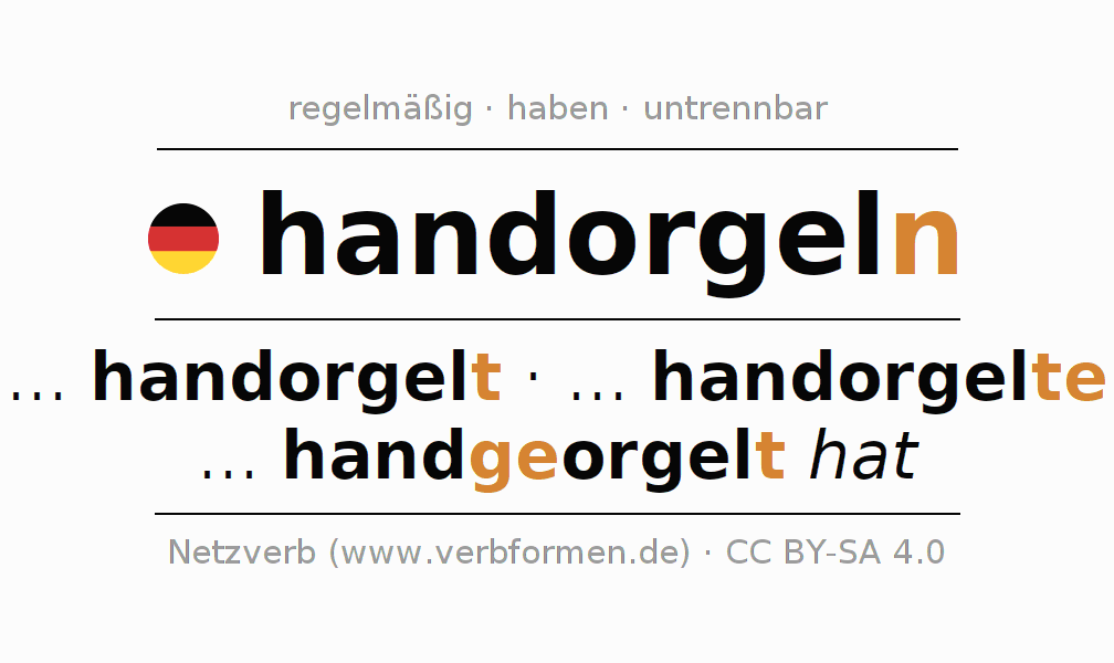 Das Verb handorgeln vollständig in allen Personen und Numeri im Infinitiv Präsens Perfekt konjugiert