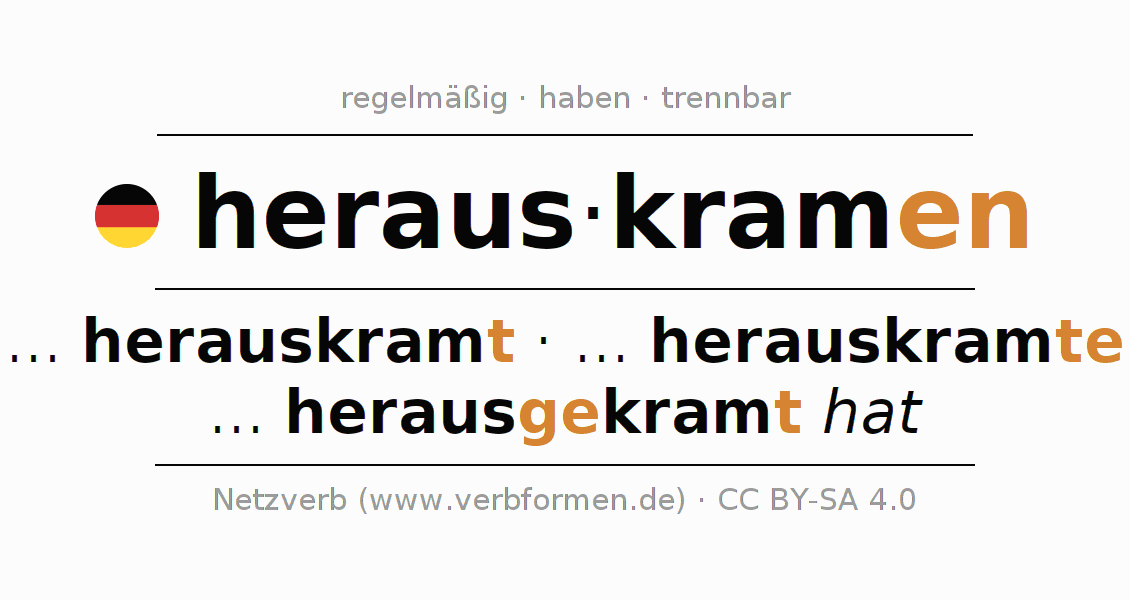Das Verb herauskramen vollständig in allen Personen und Numeri im Infinitiv Präsens Perfekt konjugiert