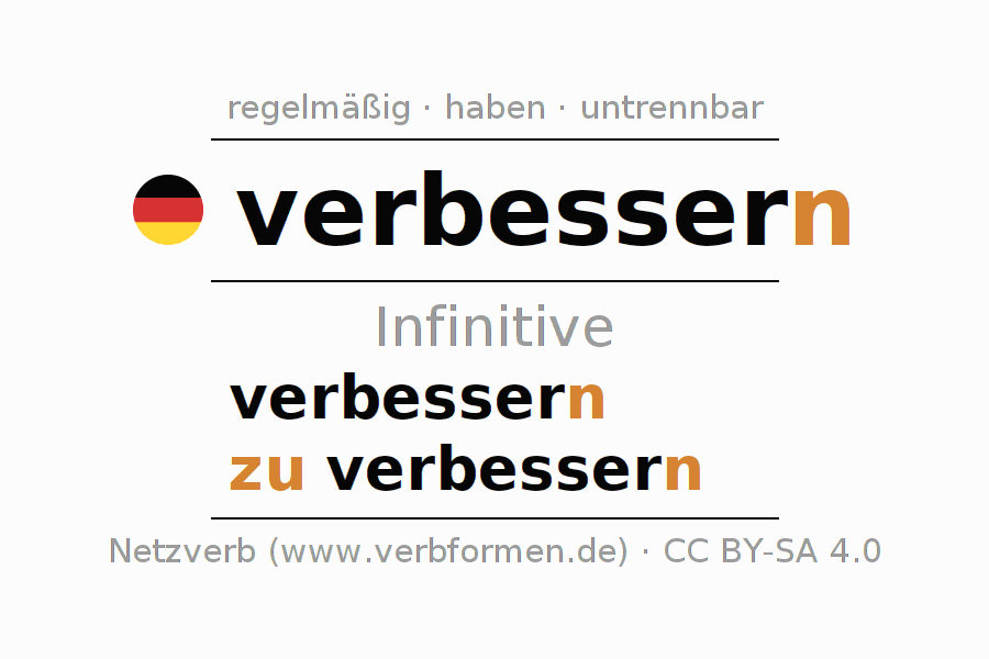 Die Konjugation von verbessern im Infinitiv Präsens Perfekt Grundform Aktiv ist: verbessern, zu verbessern.Die Bildung dieser Formen entspricht gewissen grammatischen Regeln. So auch die Vorgaben zur Konjugation der einfachen Verbformen von verbessern im Infinitiv. 2Kommentare ☆5.0