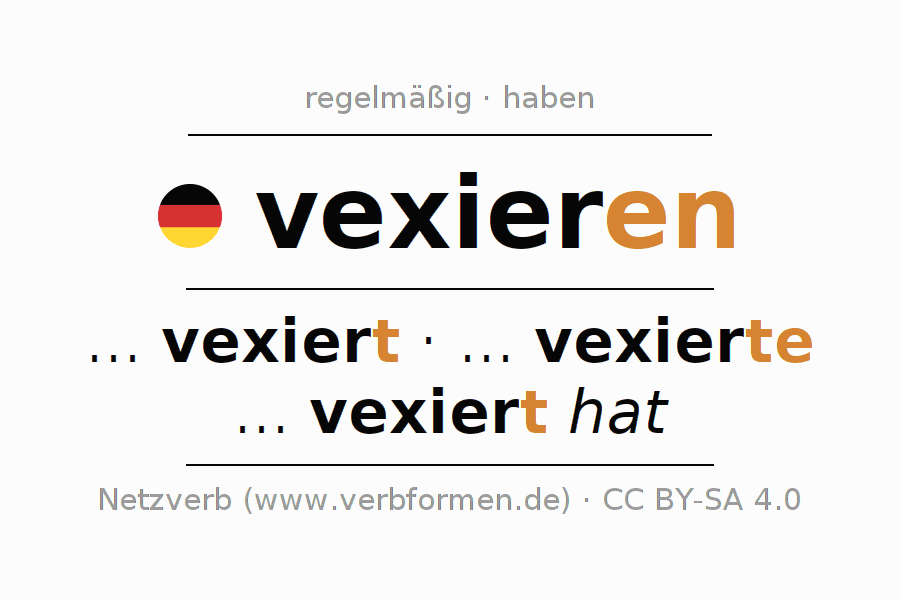 Das Verb vexieren vollständig in allen Personen und Numeri im Infinitiv Präsens Perfekt konjugiert