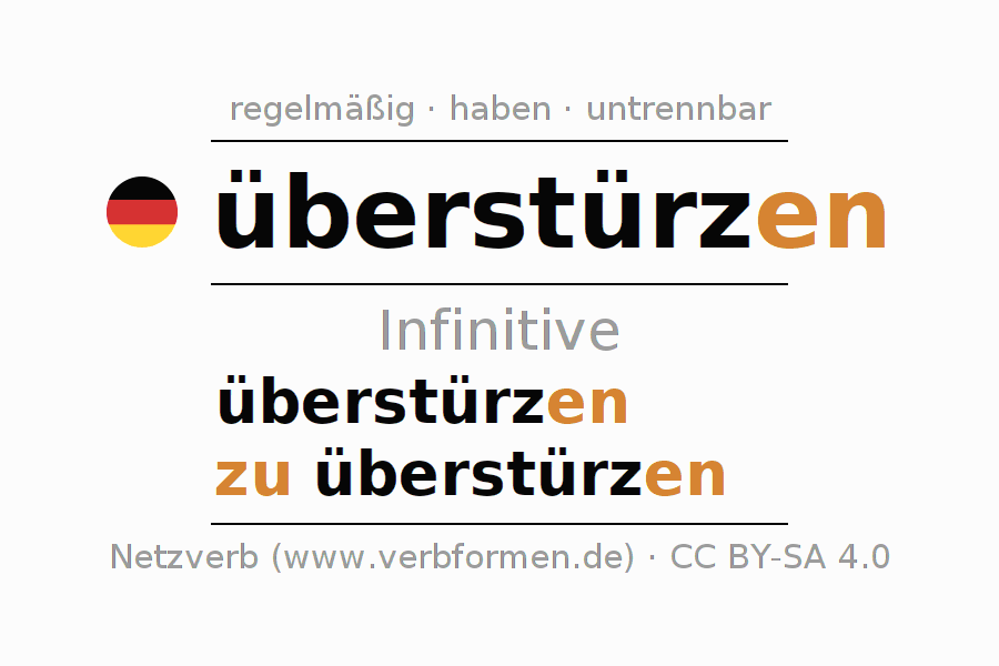 Das Verb überstürzen vollständig in allen Personen und Numeri im Infinitiv Präsens Perfekt konjugiert