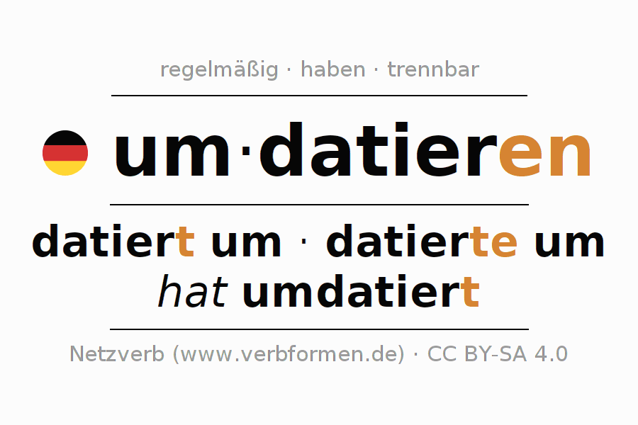 Das Verb umdatieren vollständig in allen Personen und Numeri im Infinitiv Präsens Perfekt konjugiert