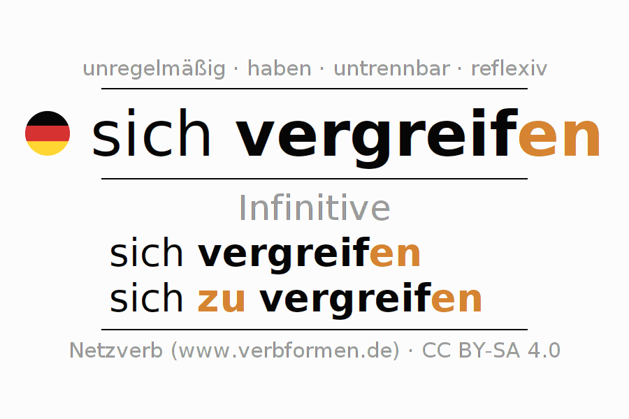 Die Formen im Infinitiv von sich vergreifen sind: sich vergreifen, sich zu vergreifen. An die Basis greif (Verbstamm) wird die Endung -en (Suffix) angehängt. Bei der Bildung des Infinitivs mit zu wird das zu dem normalen Infinitiv getrennt vorangestellt, da es keine trennbaren Erstteile (Suffixe) besitzt. Die Bildung der Formen entspricht den grammatischen Regeln zur Konjugation der Verben im Infinitiv. Kommentare