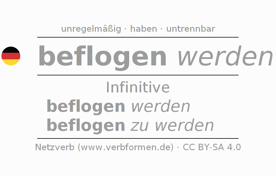 Die Konjugation von befliegen im Infinitiv Präsens Perfekt Grundform Vorgangspassiv ist: beflogen werden, beflogen zu werden.Die Bildung dieser Formen entspricht gewissen grammatischen Regeln. So auch die Vorgaben zur Konjugation der einfachen Verbformen von befliegen im Infinitiv. Kommentare ☆
