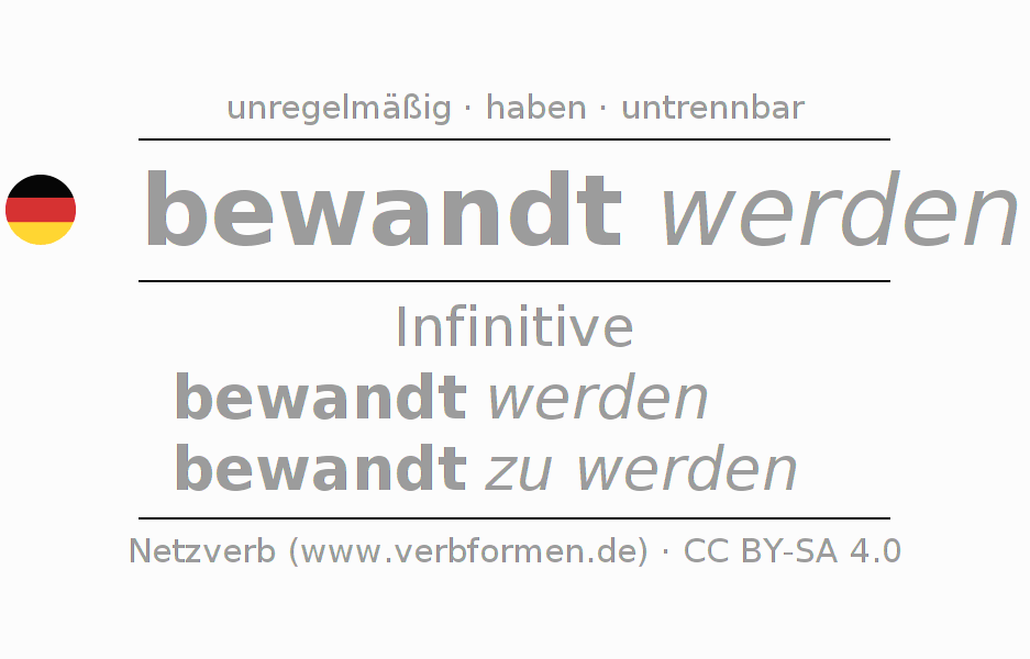 Die Konjugation von bewenden im Infinitiv Präsens Perfekt Grundform Vorgangspassiv ist: bewandt werden, bewandt zu werden.Die Bildung dieser Formen entspricht gewissen grammatischen Regeln. So auch die Vorgaben zur Konjugation der einfachen Verbformen von bewenden im Infinitiv. Kommentare ☆