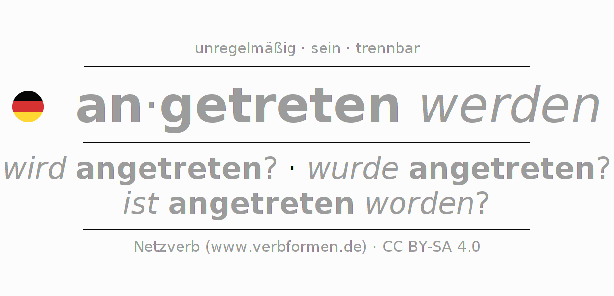 Die Konjugation von antreten im Infinitiv Präsens Perfekt Grundform Vorgangspassiv ist: angetreten werden, angetreten zu werden.Die Bildung dieser Formen entspricht gewissen grammatischen Regeln. So auch die Vorgaben zur Konjugation der einfachen Verbformen von antreten im Infinitiv. Kommentare ☆