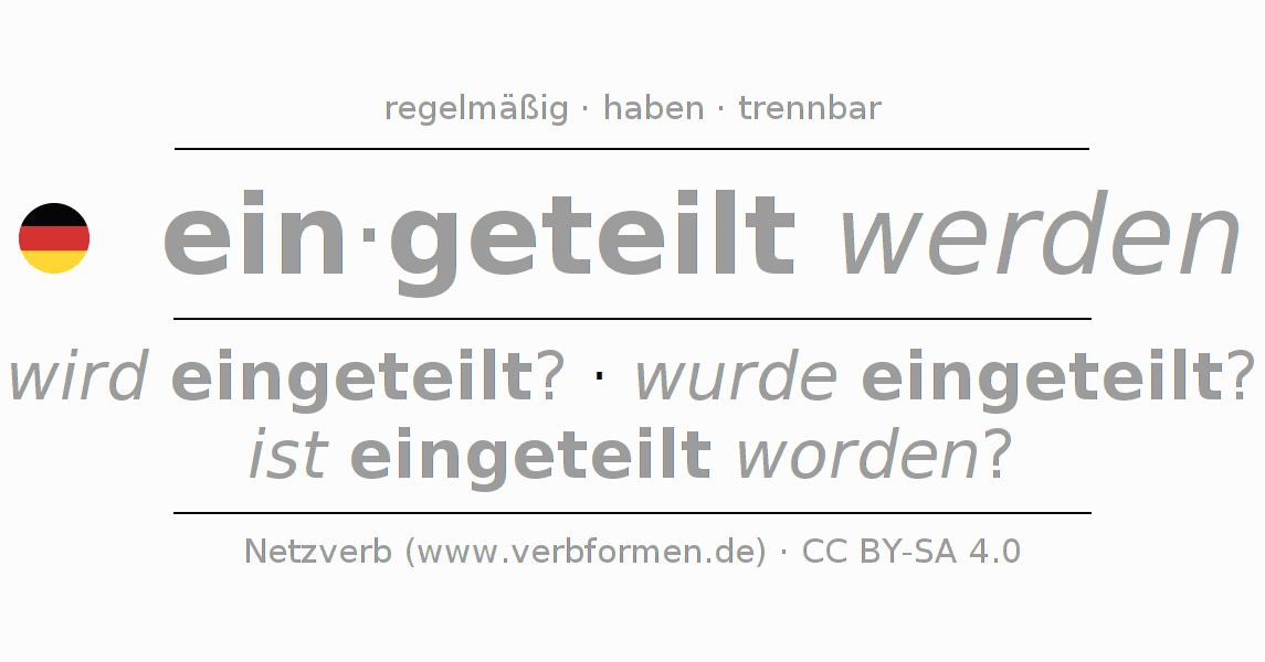 Die Konjugation von einteilen im Infinitiv Präsens Perfekt Grundform Vorgangspassiv ist: eingeteilt werden, eingeteilt zu werden.Die Bildung dieser Formen entspricht gewissen grammatischen Regeln. So auch die Vorgaben zur Konjugation der einfachen Verbformen von einteilen im Infinitiv. Kommentare ☆
