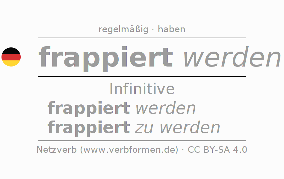 Die Konjugation von frappieren im Infinitiv Präsens Perfekt Grundform Vorgangspassiv ist: frappiert werden, frappiert zu werden.Die Bildung dieser Formen entspricht gewissen grammatischen Regeln. So auch die Vorgaben zur Konjugation der einfachen Verbformen von frappieren im Infinitiv. Kommentare ☆