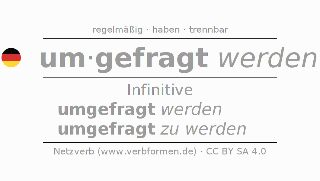 Die Konjugation von umfragen im Infinitiv Präsens Perfekt Grundform Vorgangspassiv ist: umgefragt werden, umgefragt zu werden.Die Bildung dieser Formen entspricht gewissen grammatischen Regeln. So auch die Vorgaben zur Konjugation der einfachen Verbformen von umfragen im Infinitiv. Kommentare ☆